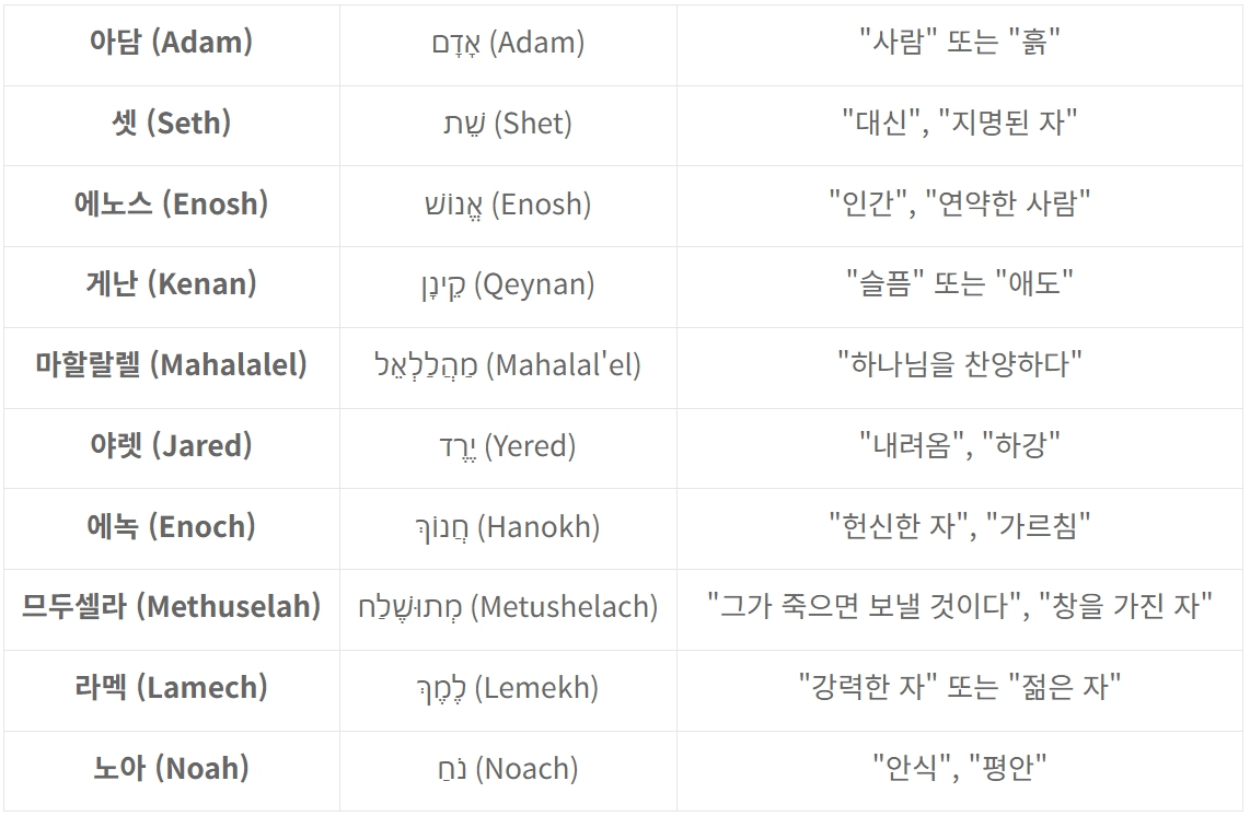 | 에녹 (Enoch) | חֲנוֹךְ (Hanokh) | "헌신한 자", "가르침" |